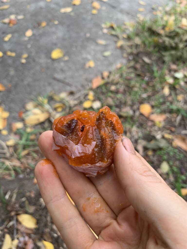 To other folks: bring a fruit picker or long tool that can trim off a laden branch. There are two of these trees and one can be climbed but requires long reach even up there. The fruits are astringent when unripe. Ripe when absolutely gooey. The fallen fruits are perfect but will have a spot of dirt to pick off. There are apparently more of these trees within the garden nearby.